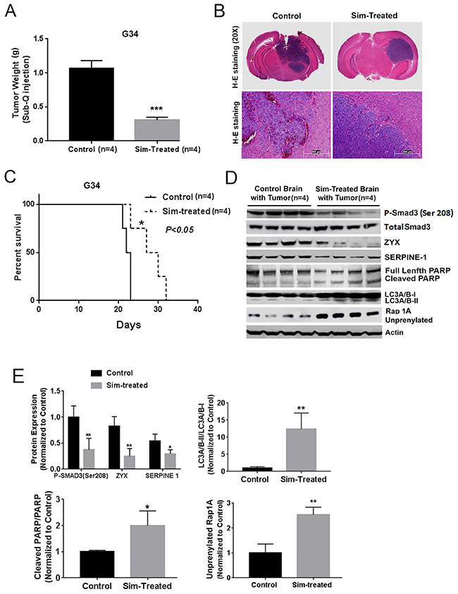 Figure 5: Simvastatin prolonged survival, inhibited TGF-β signaling and prenylation, and induced apoptosis and autophagy in vivo. (A) Simvastatin reduced G34 tumor growth in a mouse subcutaneous model. (B) H+E staining of intracranial tumors from control and twice-daily simvastatin-treated (50mg/kg) group. (C) Twice-daily simvastatin treatment (50mg/kg) prolonged mouse survival in an intracranial G34 model. (D) and (E) Simvastatin reduced expression of the Smad3 phosphorylation at Ser-208, TGF-β target proteins ZYX and SERPINE1, increased cleaved PARP, LC3A/B-II, and unprenylated Rap1A expression in tumor-bearing brain hemispheres in the experiment from (C) as indicated by immunoblot (D) and quantification of immunoblot bands (E). All values are the mean±SD of four experiments. Sim: Simvastatin. *, P<0.05; **, P<0.01. ***, P<0.001.