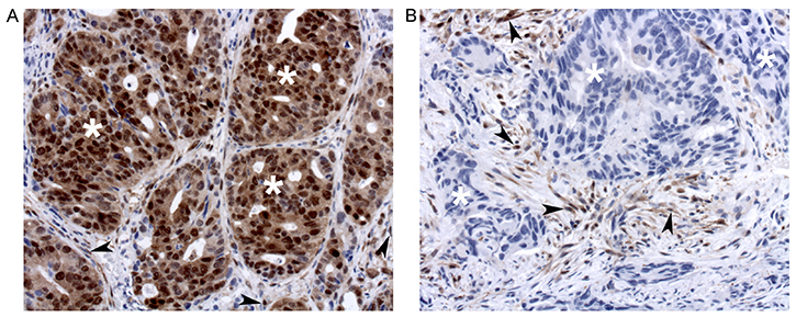 Figure 1: Phospho-ERK staining of tumors that show strong (A) or no (B) staining of cancer cells (exemplified with white asterisks). Note that stromal cells (arrowheads) are strongly stained in both A and B.