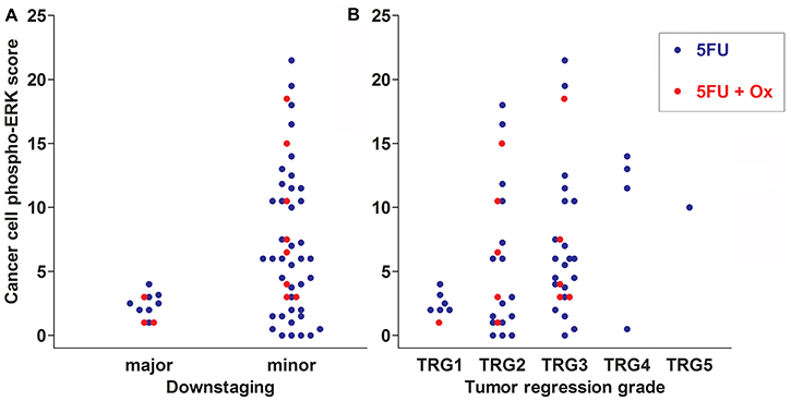 Figure 2: Scatter plots showing downstaging (A) and TRG scores (B) in relation to cancer cell phospho-ERK scores for all 59 patients of cohort 1. Data for patients treated with 5FU alone are shown as blue dots and for 5FU+oxaliplatin as red dots. Note that none of the patients with cancer cell phospho-ERK levels above the median score (4.5) respond with either major downstaging or complete tumor regression (TRG1 in A). The difference in cancer cell phospho-ERK scores between major and minor downstaging is significant both for all patients (p = 0.007) as well as for the 5FU+oxaliplatin group (p = 0.02). It is borderline significant (p = 0.06) for the group receiving 5FU alone. Note in B that the cancer cell phospho-ERK score is lower in patients experiencing higher degrees of tumor regression (1 = total; 5 = none). The difference in median cancer cell phospho-ERK scores between the TRG1 and TRG3-5 group is significant for all patients (p < 0.02) as well as for the 5FU group alone (p = 0.03), whereas the 5FU+oxaliplatin group only contained a single case of complete tumor regression.