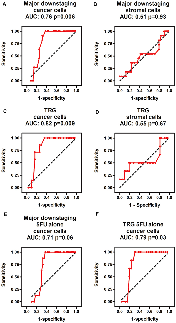 Figure 3: ROC diagrams showing the predictive power of phospho-ERK scores in cancer cells (A, C, E, F) but not in intertwining stromal cells (B, D) for predicting major downstaging (A, B, E) and TRG1 (C, D, E, F) in all patients (A–D) as well as the subgroup of patients treated with 5FU alone (E, F). The black dotted line in each diagram illustrates an imaginary line of no predictive power (AUC = 0.5).
