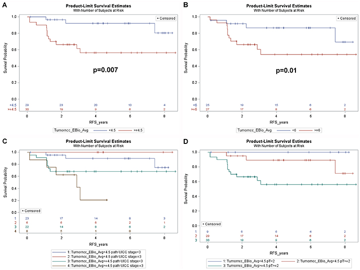 Further analyses revealed that the predictive value of the cancer cell phospho-ERK scores mainly reflected an impact on high-risk patients. The impact of phospho-ERK levels on RFS in patients with UICC stage II or III was significant at the p = 0.01 level (Figure 4B). Note that the median score for cancer cell phospho-ERK (6.0) in stage II-III patients was higher than the population median (4.5). It was noteworthy that UICC stage III patients, who had low phospho-ERK scores, showed an RFS that was not significantly different from that of stage I-II patients (with low phospho-ERK scores) whilst stage III patients with high phospho-ERK scores showed very poor RFS (Figure 4C). These differences were evident also when only T categories were analysed (Figure 4D).