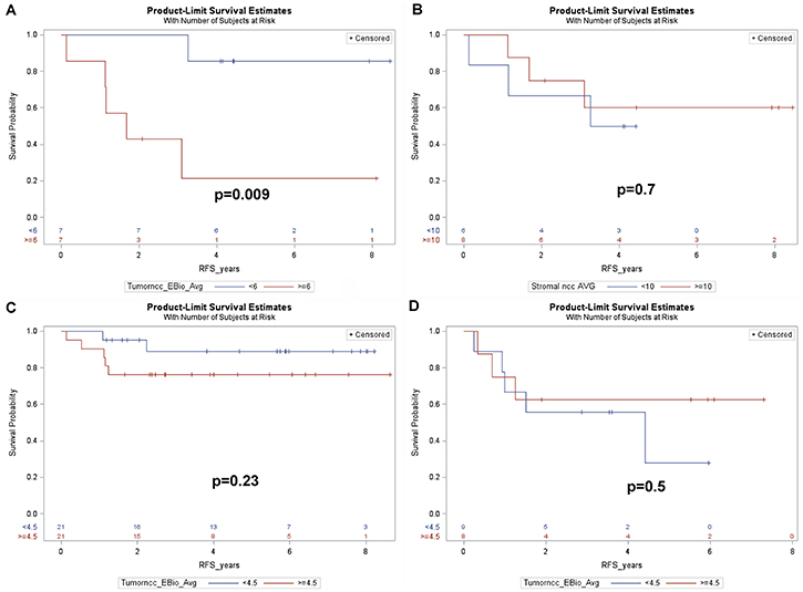 Figure 5: Kaplan-Meier plots showing (A) RFS for the 14 patients of cohort1, who received adjuvant treatment, dichotomized by the median cancer cell phospho-ERK score (6.0) (B) RFS for the 14 patients of cohort 1, dichotomized by the median stromal cell phospho-ERK score. (C) RFS for the 42 remaining patients of cohort 1, who did not receive adjuvant treatment (3 further patients of cohort1 lacked data regarding adjuvant treatment) dichotomized as in A. (D) RFS for the 17 patients of cohort 2, who fulfilled the criteria, but who did not receive, adjuvant treatment, dichotomized by the median cancer cell phospho-ERK score.