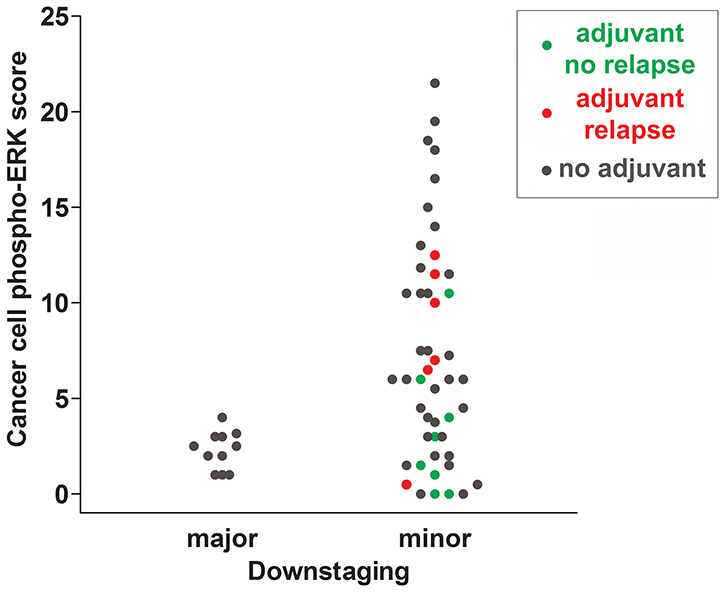 Figure 6: Scattergram summarizing cancer cell phospho-ERK scores for all individuals of cohort 1. Patients receiving adjuvant treatment without subsequent recurrences are indicated with green dots and patients receiving adjuvant treatment with subsequent recurrences are indicated with red dots. Patients not receiving adjuvant treatment are shown in grey. Note that the majority of patients not experiencing recurrences had phospho-ERK scores below the median.
