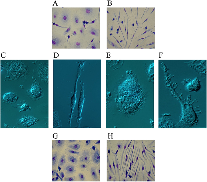 Figure 2: Ibrutinib-induced differentiation into fibrocyte-like cells. Purified human monocytes were cultured in the presence of 100 ng/mL M-CSF. (A–F) Monocytes were cultured in serum-containing medium in the absence (A, C, E) or presence (B, D, F) of 10 μM Ibrutinib. After 10 days, cells were air-dried, fixed and stained with May-Grunwald and Giemsa solutions for optic microscopy (A, B) or captured unstained for interference microscopy (C–F). Monocytes cultured with only M-CSF (A, C, E) displayed a fried-egg or slightly spindle shape with round nuclei, typical of M-CSF-differentiated cells. Monocytes cultured with M-CSF + Ibrutinib (B, D, F) acquired a very elongated morphology with oval nuclei, consistent with a clear-cut differentiation into fibrocyte-like cells. Images captured by interference microscopy at higher magnification (100x) showed the morphological properties of a monocyte cultured with only M-CSF (E) or undergoing fibrocyte differentiation upon stimulation with M-CSF + Ibrutinib (F). In the latter case, numerous filopodia extend beyond the leading edge of the cytoplasmic projection. Images are representative of 10 separate experiments. (G–H) Monocytes were cultured with 40% serum of a CLL patient withdrawn before (G) and after (H) the beginning of Ibrutinib treatment. After 10 days, cells were air-dried, fixed and stained with May-Grunwald and Giemsa solutions. A representative experiment out of 6 is shown.