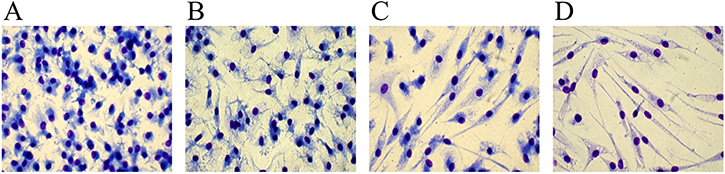 Figure 3: Differences between serum-containing and serum-free media in fibrocyte-like cells differentiation. Purified human monocytes were cultured in Neurobasal medium in the presence of 100 ng/mL M-CSF. (A, C) 20% FCS was added to the medium and cells were cultured in the absence (A) or presence (C) of 10 μM Ibrutinib. (B, D) Cells were cultured without adding serum, in the absence (B) or presence (D) of 10 μM Ibrutinib. A representative experiment out of 3 is shown. Images are captured at 40x magnification.