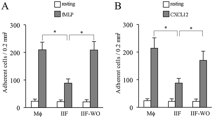 Figure 5: Ibrutinib-induced adhesion impairment in differentiated cells. Data are presented for Mϕ, IIF and IIF after washing out Ibrutinib (IIF-WO). (A) Number of cells adherent to ICAM-1 upon stimulation with buffer (resting) or fMLP. (B) Number of cells adherent to ICAM-1 upon stimulation with buffer or CXCL12. Data presented are mean ± SD and are representative of 3 experiments. *p < 0.001 by one-way analysis of variance and Bonferroni post-hoc analysis.