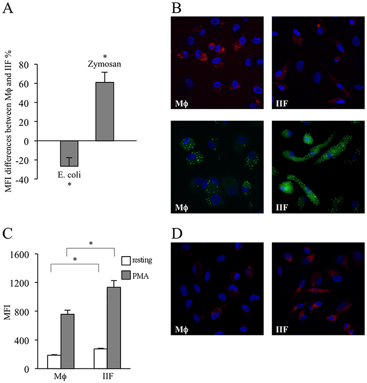 Figure 6: Evaluation of phagocytic ability and ROS production in differentiated cells. The results have been evaluated in flow-cytometry and expressed as MFI and by fluorescence microscopy. They are mean ± SD and are representative of 3 experiments. (A) Mϕ and IIF were exposed to E. coli particles or zymosan labelled with a pH-sensitive fluorophore. MFI differences between macrophages and fibrocytes, expressed as percentages, are shown. In each condition autofluorescence was subtracted. *p < 0.05. (B) Fluorescence microscopy of Mϕ (upper left and lower left) and IIF (upper right and lower right) incubated with E. coli particles (upper panels) or zymosan (lower panels). (C) Mϕ and IIF were incubated with CellRox Deep Red reagent, both in basal condition (resting) and after stimulation with PMA. In each condition autofluorescence was subtracted. *p < 0.001. (D) Fluorescence microscopy of resting Mϕ (left panel) and IIF (right panel) incubated with CellRox Deep Red reagent.