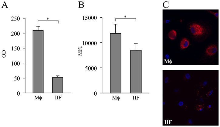 Figure 7: Evaluation of MTT metabolism and mitochondrial amount in differentiated cells. (A) Mϕ and IIF were added with MTT and its catalyzation to MTT-formazan was measured. The results are expressed as optical density (OD). They are mean ± SD and are representative of 5 experiments. *p < 0.001. (B) Mϕ and IIF were incubated with MitoTracker Deep Red FM. Then they were detached and recorded by flow cytometry. Data are expressed as MFI. In each condition autofluorescence was subtracted. The results are mean ± SD and are representative of 3 experiments. *p < 0.05. (C) Fluorescence microscopy of Mϕ (upper panel) and IIF (lower panel) incubated with MitoTracker Deep Red FM.
