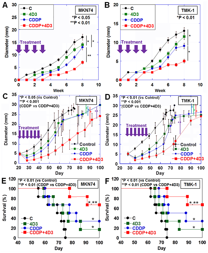 In the second set of experiments conducted using the mouse model, tumors grown to a diameter of 5 mm were treated with CDDP and/or 4D3 (Figure 4C, 4D). Treatment with 4D3 or CDDP alone inhibited tumor growth significantly in comparison with control mice in both MKN74 and TMK-1 tumors. Concurrent treatment with CDDP and 4D3 showed a more pronounced inhibitory effect in both MKN74 and TMK-1 tumors than did treatment with CDDP alone. Moreover, concurrent treatment with CDDP and 4D3 showed a synergic effect against both cell types (synergic indices were 5.1 and 4.9 in MKN74 and TMK-1, respectively). The survival analysis of the mice is shown in Figure 4E and 4F. For both cell lines, mice treated with 4D3 or CDDP alone survived for longer than control mice. Concurrent treatment with CDDP and 4D3 improved their survival even further.