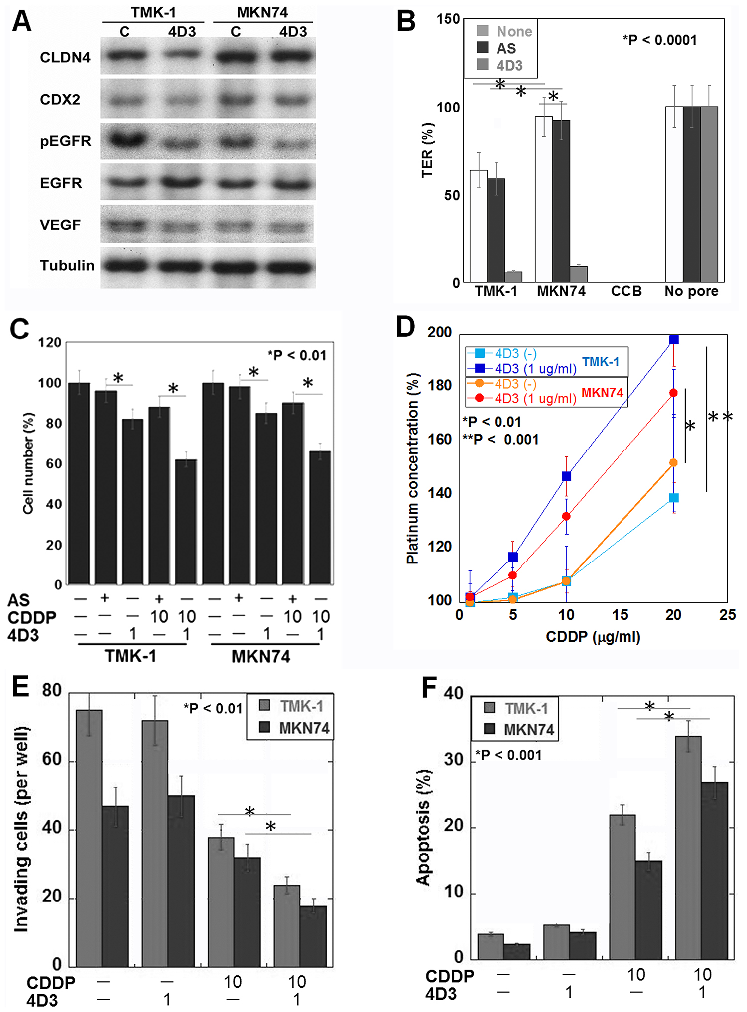 Gastric cancer is currently the third most common cause of cancer-related death in Japan [1]. While the overall 5-year survival rate for the disease has increased to 73.1% due to improved methods for early diagnosis, and increased patient access to endoscopic treatment [2], advanced gastric cancer cases (stages III or IV) are still characterized by a poor prognosis, (5-year survival rate, 47.2% and 7.3%, respectively) [2]. A recent study emphasized the importance of multidisciplinary treatment in gastric cancer, particularly including key therapeutic agents, cis-diamminedichloroplatinum (CDDP), 5-fluorouracil (5-FU) and taxans [3]. In Japanese gastric cancer treatment guideline, CDDP plus S-1 (tegafur/gimeracil/oteracil) therapy is recommended as the standard 1st line chemotherapy for gastric cancer [3]. As the first treatment at the present time, CDDP plus S-1 therapy is considered to contribute most to the extension of survival time. Capecitabine plus CDDP and S-1 plus docetaxel are the second recommended protocols. We have reported that anti-claudin-4 (CLDN4) antibody enhances anti-tumoral effect of 5-FU by reducing barrier function of the tight junction in colorectal cancer [4]. In the present study, we are prompted to evaluate sensitizing effect of CDDP in gastric cancer.