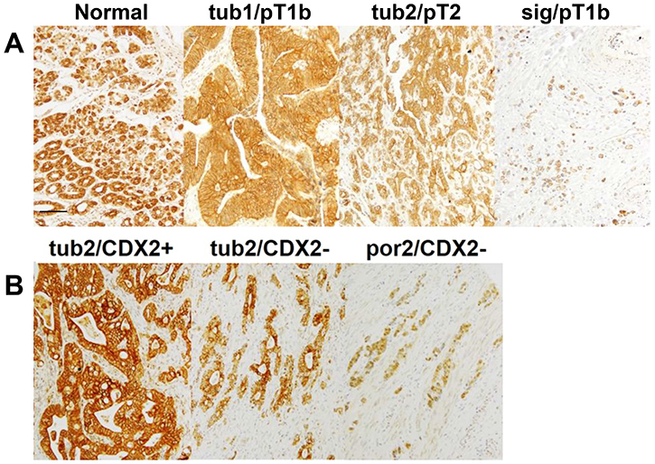 Figure 1: CLDN4 expression in gastric adenocarcinomas. (A) A conducted immunohistochemical evaluation identified CLDN4 expression at the cytoplasmic membrane of the normal gastric mucosa, and in both the cytoplasmic membrane and cytoplasm of three representative gastric cancer cases. Notably, undifferentiated cancer cases exhibited lower CLDN4 expression levels than differentiated cases. (B) A comparison of CLDN4 expression levels and patient CDX2 statuses showed that CLDN4 expression was lower in CDX2(–) than CDX2(+) cases. Bar, 100 μm. Tub1, well-differentiated tubular adenocarcinoma; tub2, moderately differentiated tubular adenocarcinoma; sig, signet-ring cell carcinoma; por2, poorly differentiated adenocarcinoma; pT1b, invasion into the submucosal layer; pT2, invasion into the muscle propria layer.