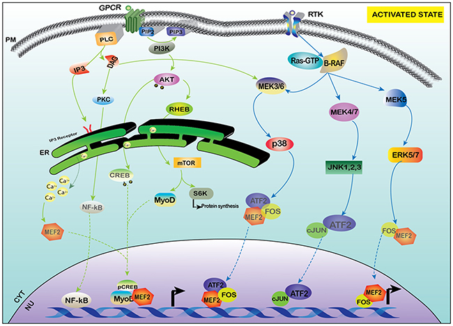 Figure 3: Activation of MEF-2 by PI3K-AKT and MAPK signaling. MEF-2 is also activated by PI3K/AKT pathway which activates mTOR as a downstream target and also increases the transcription of MyoD and MEF-2 along with other transcription factors. The receptor tyrosine kinase (RTK) under specific stimulus activates various different transcription factors of AP-1 family like c-JUN and FOS and aids in the activation of MEF-2 via the MAPK family of MEK/ERK.