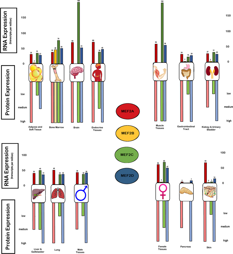 Figure 1: Basal expression of MEF-2 isoforms in organ systems and tissues in RNA and protein. The expression of MEF-2 isoforms are illustrated in the various organ systems at the transcriptome level in TPM (transcripts for kilobase million) via RNA-seq expression and the protein expression from high to low levels which is obtained from the immune-cytochemistry quantification (https://www.proteinatlas.org/).
