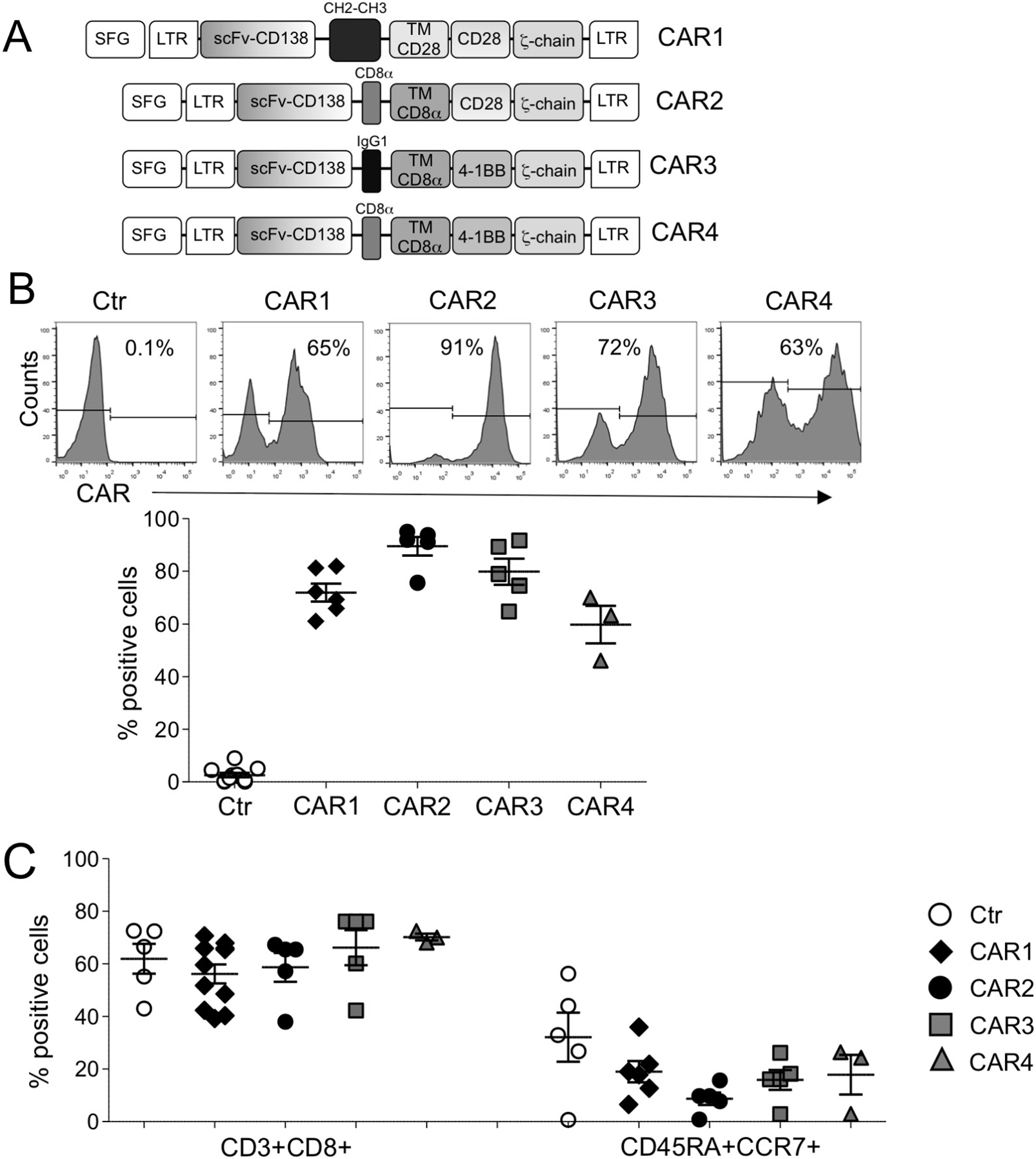 Figure 1: Characterization of CD138.CAR-Ts. (A) shows the schema of the CD138.CAR retroviral constructs (named CAR1, CAR2, CAR3 and CAR4) used to transduce activated T cells. (B) shows CD138.CAR expression evaluated by flow cytometry in control T cells (Ctr-Ts) and in T cells transduced with the four different CD138.CAR constructs. Upper panels are from one representative donor and lower graph shows cumulative data (n = 3-6). (C) shows the frequency of CD8 and and central memory subsets (CD45RA+CCR7+) gated on CD3+ cells for Ctr-Ts and CD138.CAR-Ts generated from healthy donors (n = 3-6).