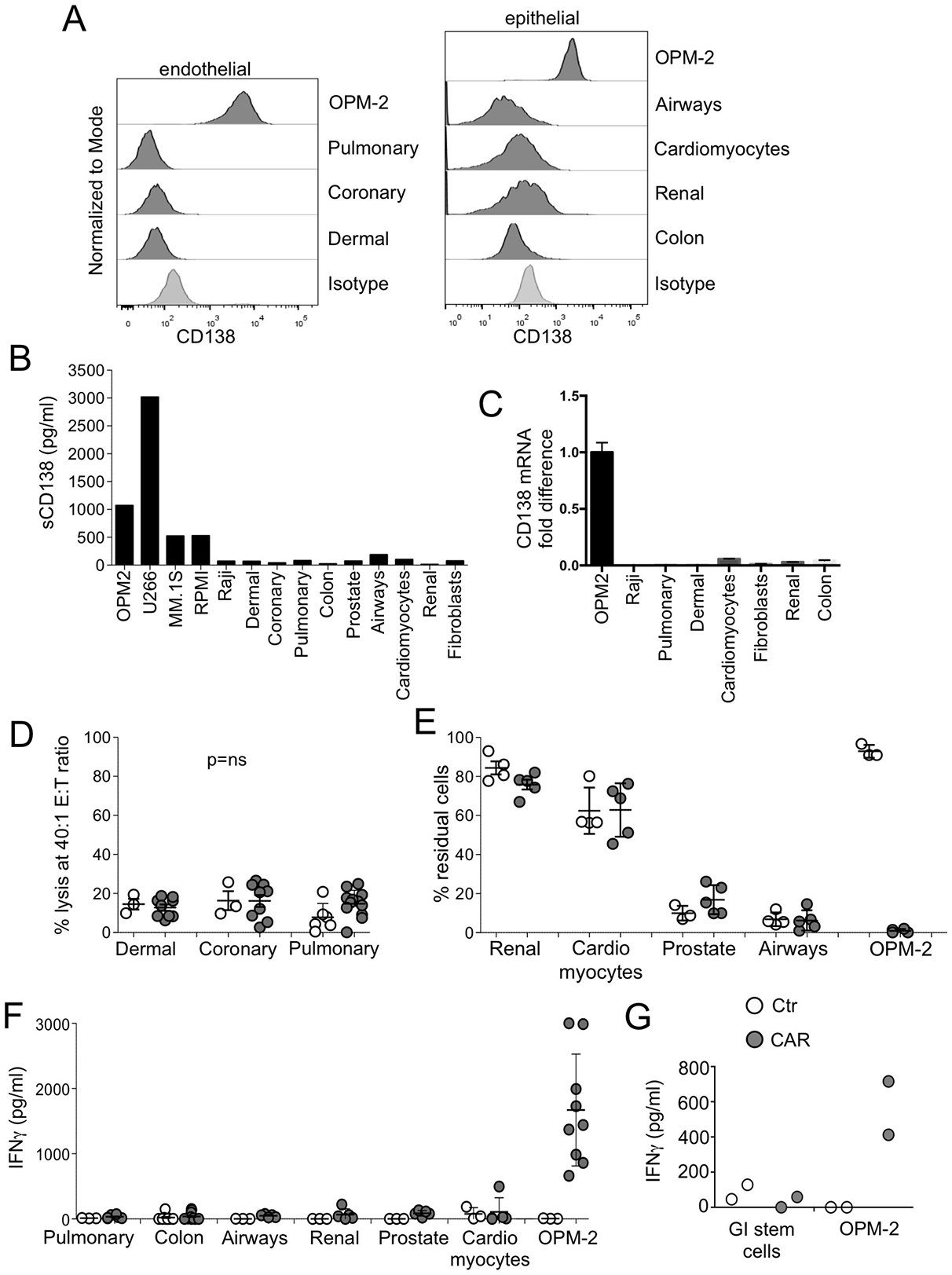 Figure 3: Safety of CD138.CAR-Ts. (A) shows the expression of the CD138 by commercially available endothelial (right) or epithelial cells (left). Isotype control (of dermal cells for endothelial cells and colon cells for epithelial cells) and CD138 expression of OPM-2 cells are also included. (B) shows the evaluation of soluble CD138 in the supernatant of cultured cells using a specific ELISA assay. (C) shows the level of CD138 mRNA of cultured cells using qPCR. Data are shown as fold change as compared to the negative control (Raji). (D) shows the results of a standard 51Cr release assay of endothelial cells at the 40:1 E:T ratio by Ctr-Ts or CD138.CAR-Ts (CAR2, 3 and 4). Each symbol represents a donor and the lines represent the mean and SEM for the groups (Shown are p ns value, paired t-test.). (E) shows the evaluation of residual cells (CD138+ tumor cells, OPM-2 or commercially available epithelial or endothelial cells) when co-cultured at 1:1 ratio with Ctr-Ts or CD138.CAR-Ts (CAR 2 and 3 generated from healthy donors). Cells were quantified by flow cytometry. Each symbol represents a donor and the lines represent the mean and SEM for the groups. (F) shows the quantification of IFNγ released by Ctr-Ts or CD138.CAR-Ts co-cultured for 24 hrs with OPM-2 cells (positive CD138 control) or commercially available normal cells, and quantified by CBA assays (p = ns, one-way ANOVA). (G) shows the production of IFNγ in the supernatant of OPM-2 cells or differentiated adult gastrointestinal (GI) stem cells co-cultured with Ctr-Ts or CD138.CAR-Ts (CAR3).