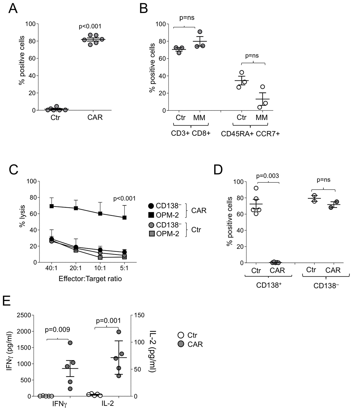 Figure 4: Function of CD138.CAR-Ts generated from MM patients. (A) shows the expression of the CAR.CD138 (CAR2) evaluated by flow cytometry in Ctr-Ts or CD138.CAR-Ts generated from 6 MM patients (p < 0.001, two-way paired t-test). (B) shows the immunophenotype of Ctr-Ts or CD138.CAR-Ts generated from MM pateints. Shown are p = ns value, paired t-test. (C) shows the results of a standard 51Cr release assay against CD138+ (OPM-2) or CD138– (Raji) tumor cell lines, at the indicted T cell to tumor cell ratio. Symbols represent the mean ± SEM of the Ts generated from 4 MM patients (p < 0.001, one-way ANOVA). (D) shows the percentage of tumor cells in experiments in which CD138+ cells (OPM-2, left) or CD138– cells (Raji, right) were co-cultured at 1:1 ratio with Ctr-Ts or CD138.CAR-Ts. T cells and tumor cells were quantified by flow cytometry (p = 0.003, and p = ns, two-way paired t-test). (E) shows the quantification of IFNγ and IL-2 released by Ctr-Ts and CD138.CAR-Ts co-cultured for 24 hrs with CD138+ cells (OPM-2) at 1:1 ratio and quantified by CBA assays (p = 0.009 for IFNγ and p = 0.001 for IL-2, two-way paired t-test).
