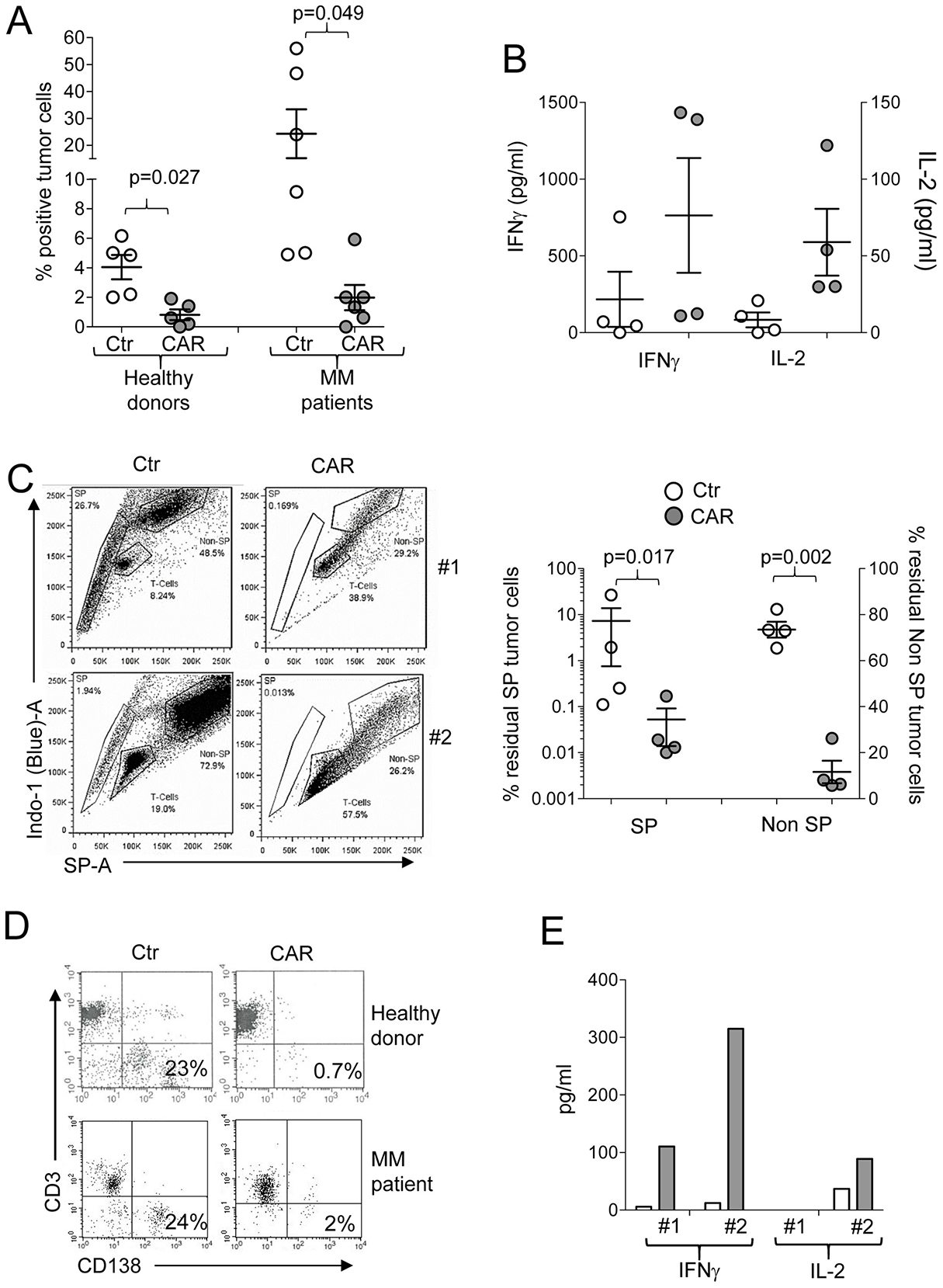 Figure 5: Targeting of primary MM tumors. (A) shows the percentage of residual MM tumor cells in experiments in which primary MM cells were co-cultured with autologous (MM patients derived) or allogeneic (healthy donor derived) Ctr-Ts and CD138.CAR-Ts. T cells and malignant plasma cells were quantified by flow cytometry. Each symbol represents a donor and the lines represent the mean and SEM for the groups. Shown are the p values using a two-way paired t-test. (B) shows the quantification of IFNγ, and IL-2 released in the supernatant by Ctr-Ts or CD138.CAR-Ts generated from MM patients co-cultured for 24 hrs with autologous malignant plasma cells, and quantified by CBA assays. (C) shows the flow plots for two representative donors of Ctr-Ts or CD138.CAR-Ts co-cultured with CD138+ RPMI MM cell line. SP cells, non-SP cells and T cells at the end of the 3 days co-culture are shown. The graph on the right panel summaries the residual SP cells and non-SP cells in co-culture with CD138.CAR-Ts obtained from healthy donors (n = 2) and MM patients (n = 2). Shown are p value of two-way paired t-test. (D) shows the flow plots for two representative donors of Ctr-Ts or CD138.CAR-Ts co-cultured with SP cells sorted from the RPMI MM cell line. (E) shows the quantification of IFNγ and IL-2 released in the supernatant of Ctr-Ts or CD138.CAR-Ts from 2 representative donors co-cultured with sorted SP cells, and quantified by CBA-assay.