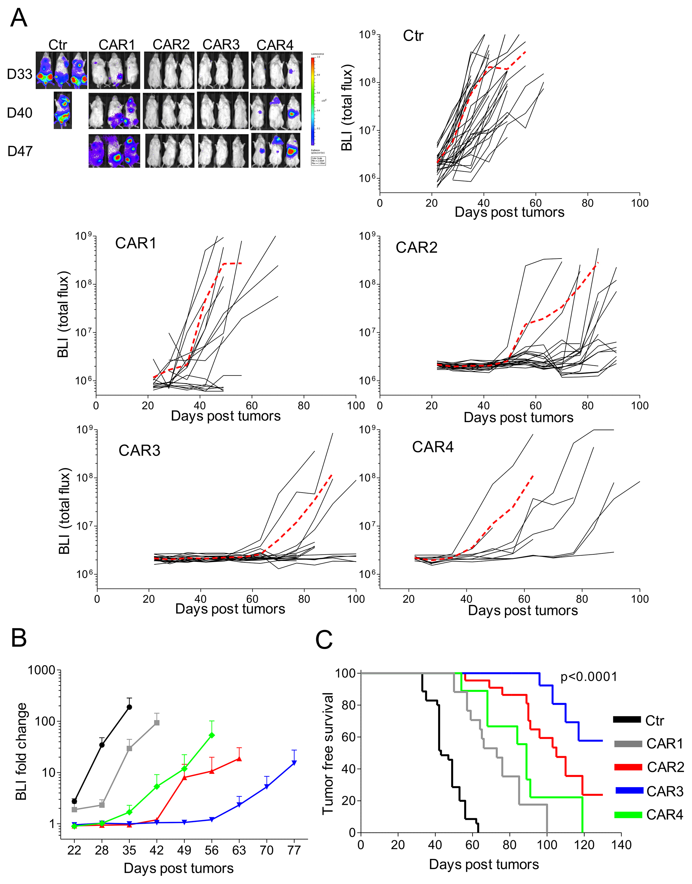 Figure 6: In vivo antitumor activity of CD138.CAR-Ts. NSG mice were engrafted with CD138+ OPM-2 cell line labeled with firefly (FF)-luciferase (4 × 106), and treated 2 weeks later with Ctr-Ts or CD138.CAR-Ts (1 × 107). (A) shows the bioluminescence signals (BLI) of Ctr-Ts and CD138.CAR-Ts. Each line shows the BLI for each mouse and the red dashed line the average of the BLI intensity for each group. (B) shows the fold expansion of BLI as compared to day 14 (day of T cell injection) summarized as average (± SEM). (C) shows the Kaplan-Meier survival curve [Ctr-Ts = 34 mice (T cells from a total of 7 donors); CAR1 = 17 mice (3 donors); CAR2 = 22 mice (5 donors); CAR3=18 mice (4 donors); CAR4 = 10 mice (2 donors)].