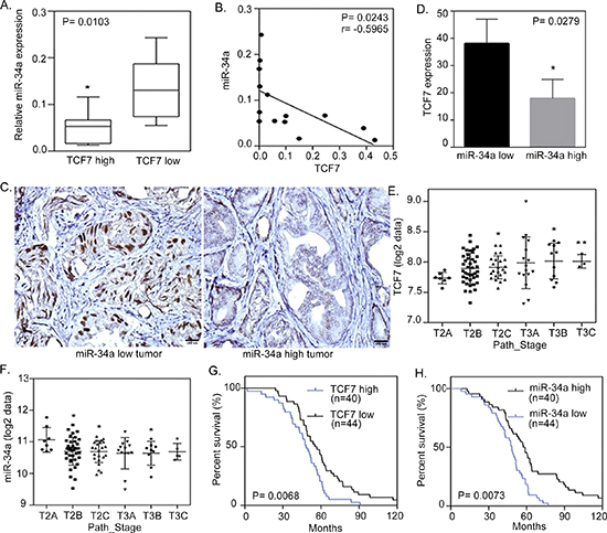 To further study the inverse relation between miR-34a and its targets in human prostate tissue, we analyzed 24 independent prostate tumors, collected form Wan Fang Hospital, Taipei Medical University, Taiwan, which were divided into two groups of ‘low’ and ‘high’ TCF7 expression, based on qRT-PCR analyses. An analysis of the variance confirmed that miR-34a was differentially expressed between the low and high expression level groups, where tissues with higher levels of TCF7 expression had a lower miR-34a expression level (Figures 4A and 4B). Furthermore, immunohistochemistry analysis showed TCF7 overexpression in the nucleus of tumors that had distant metastasis and low expression levels of miR-34a (Figures 4C and 4D). In order to prove the correlation between TCF7 and miR-34a in cancer progression, we showed that there was an increased TCF7 and decreased miR-34a expression as the cancer stage increased (Figures 4E and 4F). To test the relationship between TCF7 and miR-34a expression with prostate cancer patient survival, Kaplan-meier analysis was performed and it showed that patients with a higher TCF7 and lower miR-34a expression had a lower survival rate (Figures 4G and 4H). Taken together, it appears that miR-34a regulates WNT signaling and acts as a tumor suppressor by down-regulating TCF7 to prevent the progression of prostate cancer. These data further support the notion that a hyperactive WNT pathway reduces miR-34a expression, resulting in the activation of TCF7 and consequently leading to the promotion of malignant phenotypes of prostate cancer cells and poor clinical prognosis.