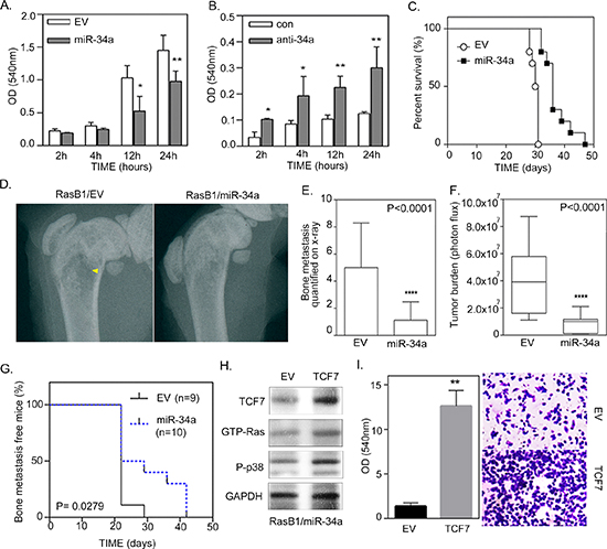 Figure 5: miR-34a regulates the invasion of Ras-activated prostate cancer cells in vitro and bone metastasis in vivo. (A) Cellular invasion of RasB1 cells, infected with an empty vector (EV) or miR-34a precursor lentivirus, through Matrigel™-coated transwells for the indicated times, fixed and measured with ELISA reader at OD 540 nm. Data represent means ± SEM, n = 5. *: vs. EV. (B) Cellular invasion of DU145 cells transfected with 50 nM of control or anti-miR-34a inhibitor for the indicated times and measured with ELISA reader at OD 540 nm. Data represent means ± SEM, n = 5. *: vs. control inhibitor. *p < 0.05, **p < 0.01. (C) Intra-cardiac injections of mice with RasB1 cells expressing an empty vector (n = 9) or miR-34a precursor (n = 10) for the indicated times. Survival rate of tumor-bearing mice in each group. (D) Radiographic image of femurs from empty vector and miR-34a bearing mice as described in (C). Yellow arrow indicates bone destruction. (E) Bone metastasis scores per mouse in tumor bearing mice as described in (C). Mice were inoculated with RasB1 cells expressing empty vector or miR-34a. (F) Intra-cardiac injections of mice with RasB1 cells expressing an empty vector (n = 9) or miR-34a precursor (n = 10) for the indicated times. Representations, along with percent survival, via bioluminescence images at the time of the first appearance of long bone metastasis are shown. (G) Bioluminescence signal of bone metastasis per mouse for mice bearing tumor cells as described in (F) at week 4. ***p < 0.001 vs EV. (H) Representative Western Blot analysis in RasB1 cells harboring miR-34a precursor (RasB1/miR-34a), transfected with an empty vector (EV) or TCF7 expression vector. (I) Cellular invasion of RasB1/miR-34a cells, infected with an empty vector (EV) or miR-34a precursor, through Matrigel™-coated transwells for 24 hours, fixed and measured with ELISA reader at OD 540 nm.