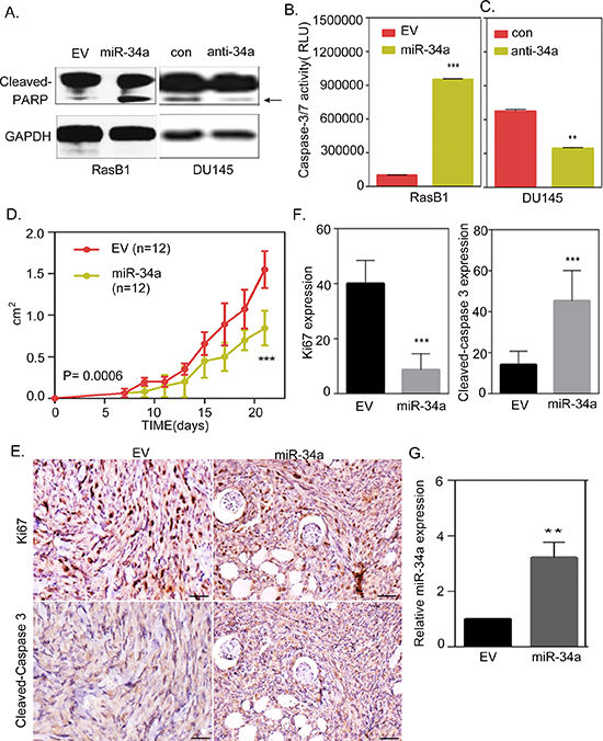 Figure 6: miR-34a overexpression contributes to the induction of apoptosis in Ras-activated prostate cancer cells. (A) Representative Western Blot analysis of cleaved-PARP in RasB1 cells transfected with an empty vector (EV) or miR-34a precursor, and in DU145 cells transfected with control or anti-miR-34a inhibitor. (B) RasB1 cells were transfected with miR-34a precursor, apoptosis was assessed by measuring caspase-3/7 activity with relative luciferase unit (RLU). Data represent means ± SEM, n = 3. *: vs. EV. (C) Parental DU145 cells were transfected with anti-miR-34a inhibitor, and apoptosis was assessed by measuring caspase-3/7 activity with relative luciferase unit. Data represent means ± SEM, n = 3. *: vs. control. (D) Growth curve of xenograft tumors in nude mice (n = 12) injected with RasB1 cells stably infected with precursors of miR-34a or an empty vector as a control. (E) Representative immuno-histochemical analysis and antibodies specific for Ki67 and cleaved-caspase 3 are shown for consecutive tissue sections of RasB1 cells expressing an empty vector or miR-34a precursor. Scale bars represent 100 μm. (F) Inverse correlations of Ki67 and cleaved-caspase 3 protein level measured by IHC in tissue sections from (E). (G) Confirmed up-regulation of miR-34a in the xenograft tumors by qRT-PCR. qRT-PCR analysis of miR-34a measured in RNA isolated from subcutaneous tumors formed by genetically-altered RasB1 cells as indicated in (D). *: vs. EV. **p < 0.01, ***p < 0.001.