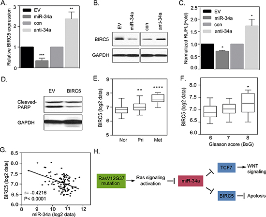 Figure 7: Activated Ras signaling induces an anti-apoptotic pathway that is regulated by miR-34a. (A and B) qRT-PCR and Western Blot analysis of BIRC5 expression in RasB1 cells transfected with an empty vector (EV)/miR-34a precursor or control/anti-miR-34a inhibitor. Relative mRNA expression was normalized to GAPDH. Data represent means ± SEM, n = 3. *: vs. EV or control. (C) The normalized reporter activity of BIRC5 3′UTR containing miR-34a target reporter in RasB1 cells with transient expression of an empty vector (EV)/miR-34a precursor or control (con)/anti-miR34a inhibitor. Renilla/luciferase activities were measured 48 hours after transfection. Data represent mean ± SEM of separate transfections, n = 3. *: vs. EV or control. *p < 0.05. (D) Representative Western Blot analysis of cleaved-PARP in RasB1 harboring miR-34a cells transiently transfected with an empty vector or BIRC5 expression vector. (E) Mean mRNA expression of BIRC5 in human normal (n = 28), primary (n = 98), and metastatic (n = 13) prostate samples from the Taylor dataset. Significance determined by one-way ANOVA. *: vs. normal. (F) Mean BIRC5 expression in clinical Gleason score (BxG) in the prostate cancer samples from the Taylor dataset. *: vs. BxG6. (G) Pearson correlation coefficient analysis of mean BIRC5 to mean miR-34a expression in primary and metastasis prostate samples (n = 111). Significance determined by Gaussian population (Pearson) and two-tailed test. (H) A proposed model describing the interactions of miR-34a with TCF7 and BIRC5, leading to the activation of WNT signaling and apoptosis in RAS-activated prostate cancer.