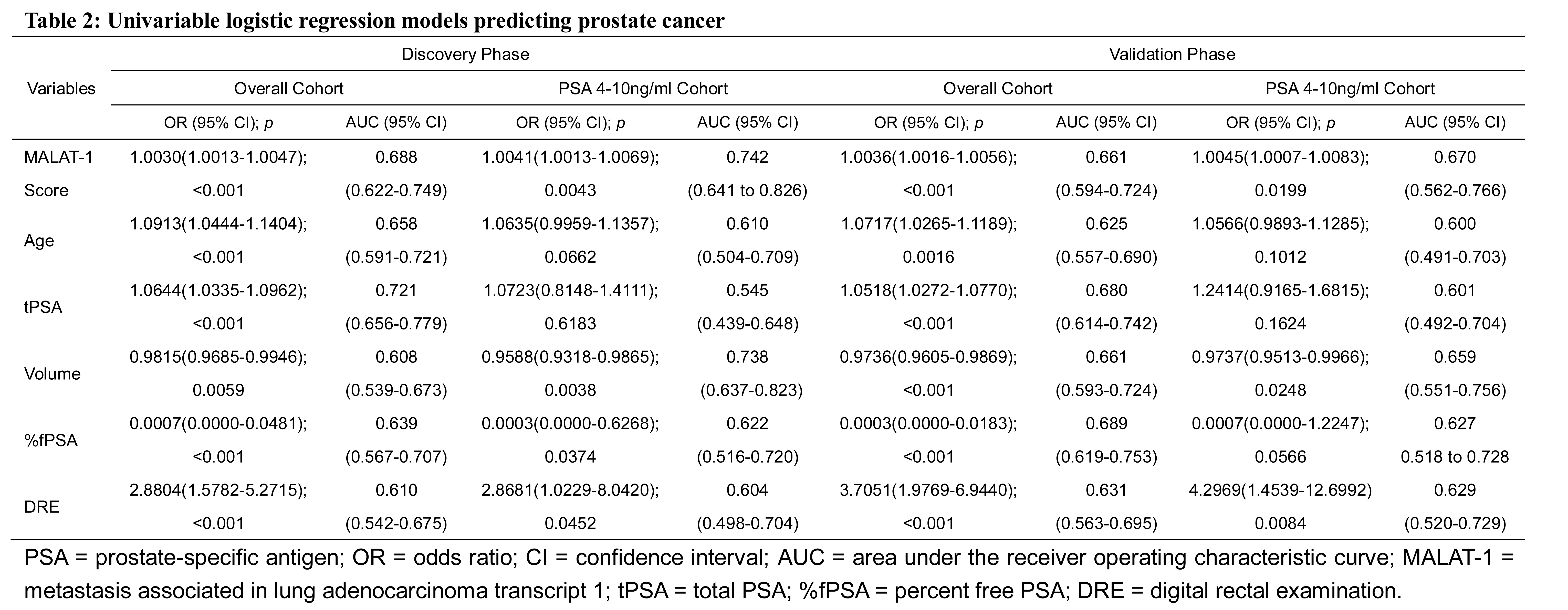 In this study, we investigated the potential diagnostic efficacy of urinary MALAT-1 transcript in a retrospective discovery phase (n=218) and a prospective multicenter cohort (n=216). We also evaluated the potential of the MALAT-1 score and the MALAT-1 model for PCa diagnosis.