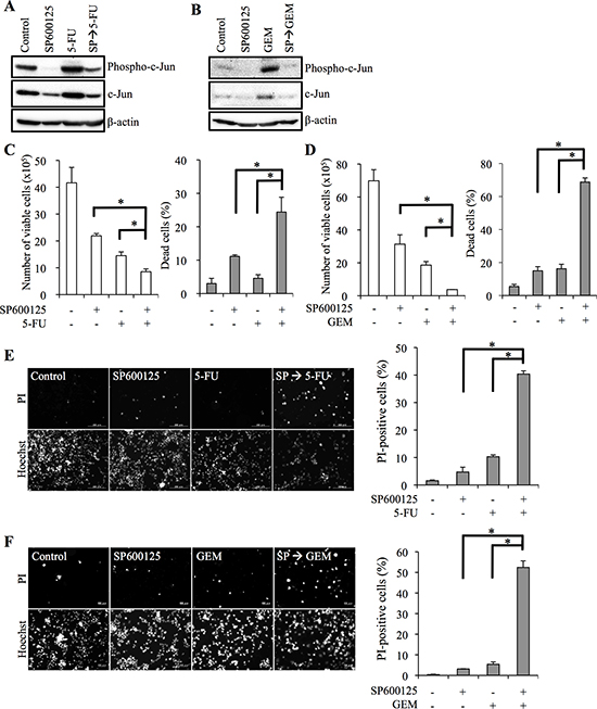 Figure 2: JNK inhibitor pretreatment sensitizes pancreatic cancer stem cells to 5-fluorouracil and gemcitabine. (A-F) PANC-1 CSLCs pretreated with or without SP600125 (SP, 20 μM) for 3 days and subsequently treated with or without 5-fluorouracil (5-FU, 20 μM) or gemcitabine (GEM, 2 μM) as indicated for 3 days in the absence of SP600125 were analyzed as follows. (A, B) Cells were subjected to immunoblot analyses for the expression of phospho- and total c-Jun. (C, D) The number of viable cells (left panels) and the percentage of dead cells (right panels) were determined using trypan blue as a vital dye. Values represent means + SD from triplicate samples of a representative experiment repeated with similar results. *P < 0.05. (E, F) Cells were subjected to cell death analysis using propidium iodide (PI) as a vital dye. Left, representative fluorescence images of PI- (upper rows) and Hoechst- (lower rows) positive cells are shown. Right, the percentage of PI-positive cells (dead cells) relative to Hoechst-positive cells (total cells) was determined. Values in the graphs represent means + SD from triplicate samples of a representative experiment repeated with similar results. *P < 0.05.