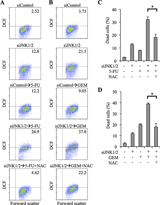 Figure 5: siRNA-mediated JNK knockdown sensitizes pancreatic cancer stem cells to 5-fluorouracil and gemcitabine in ROS - dependent manner. (A-D) PANC-1 CSLCs were transiently transfected with siRNAs against JNK1 and JNK2 (siJNK1/2) or with a control siRNA (siControl), as detailed in Materials and methods. After 8 days, the transfected cells were cultured in the presence or absence of N-acetylcysteine (NAC, 10 mM) for 30 min and further treated with or without 5-fluorouracil (5-FU, 20 μM) or gemcitabine (GEM, 2 μM) as indicated for 3 days. Then, the cells were analyzed as follows. (A, B) Cells were stained with 2′,7′-dichlorofluorescein diacetate (DCF-DA) and subjected to flow cytometric analysis to detect intracellular ROS. Representative flow cytometric plots with the percentages of ROS-positive cells are shown. (C, D) The percentage of dead cells was determined using trypan blue. Values represent means + SD from triplicate samples of a representative experiment repeated with similar results. *P < 0.05.