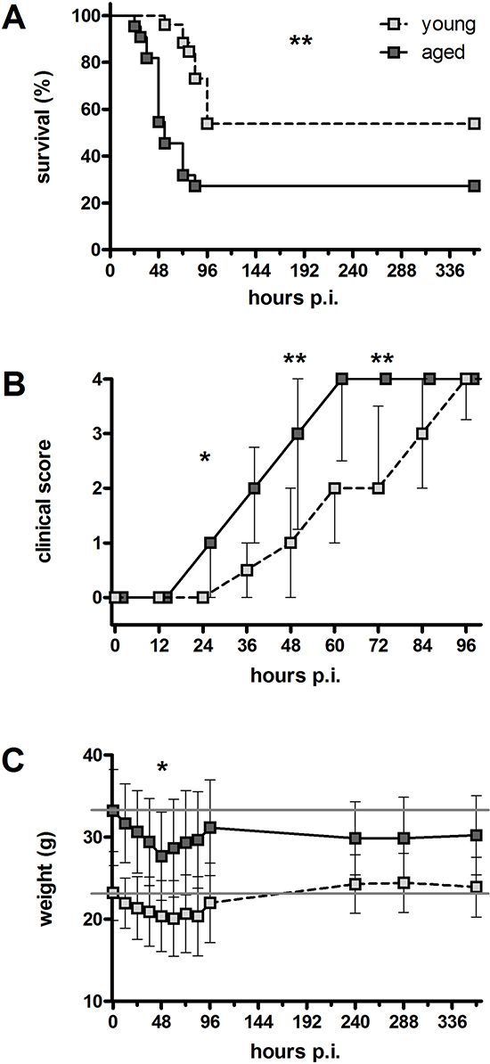 Aged mice showed a faster development of clinical symptoms compared to young mice: the clinical score of deceased aged mice was significantly higher than the clinical score of deceased young mice 24 hours p.i. (p = 0.02), 48 hours p.i. (p = 0.008), and 72 hours p.i. (p = 0.002; Figure 1B).