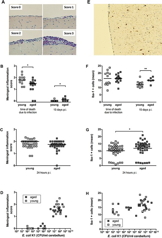 Figure 4: Quantification of infiltrating leukocytes (A–D) and microglial cells (E–H) in the CNS after intracerebral infection with E. coli K1 in young and aged mice. (A) Illustrative examples of meningeal inflammation scores in chloroacetate esterase (CAE) stainings of brain sections after intracerebral challenge with E. coli K1. CAE-positive cells in pink represent infiltrating leukocytes, magnification x 40. (B) Meningeal inflammation scores after intracerebral challenge with 1 x 105 CFU/ml were significantly lower in aged compared to young deceased mice at the time of death as a consequence of infection (*p = 0.01) but significantly higher in aged compared to young surviving mice 15 days p.i. (*p = 0.03, Mann-Whitney U-test). Symbols represent individual mice and bars indicate median values. (C) Meningeal inflammation scores of young and aged mice 24 hours after intracerebral challenge with 7.5 x 105 CFU/ml did not differ. Symbols represent individual mice and bars indicate median values. (D) The meningeal inflammation score strongly correlated with the amount of bacteria in the CNS of both aged (rs = 0.71; p = 0.0002) and young mice (rs = 0.78; p < 0.0001). (E) Illustrative example of an Iba-1-stained brain section after intracerebral challenge with E. coli K1. Iba-1+ cells in brown represent microglial cells, magnification x 20. (F) Numbers of Iba-1+ cells after intracerebral challenge with 1 x 105 CFU/ml did not differ between aged and young deceased mice at the time of death due to infection but were significantly higher in aged compared to young surviving mice 15 days p.i. (**p = 0.0095, Mann-Whitney U-test). Symbols represent individual mice and bars indicate median values. (G) Numbers of Iba-1+ cells in young and aged mice 24 hours after intracerebral challenge with 7.5 x 105 CFU/ml were significantly higher in aged compared to young mice (*p = 0.015, Mann-Whitney U-test). Symbols represent individual mice and bars indicate median values. (H) Numbers of Iba-1+ cells did not correlate with bacterial concentrations in the CNS of both aged and young mice.