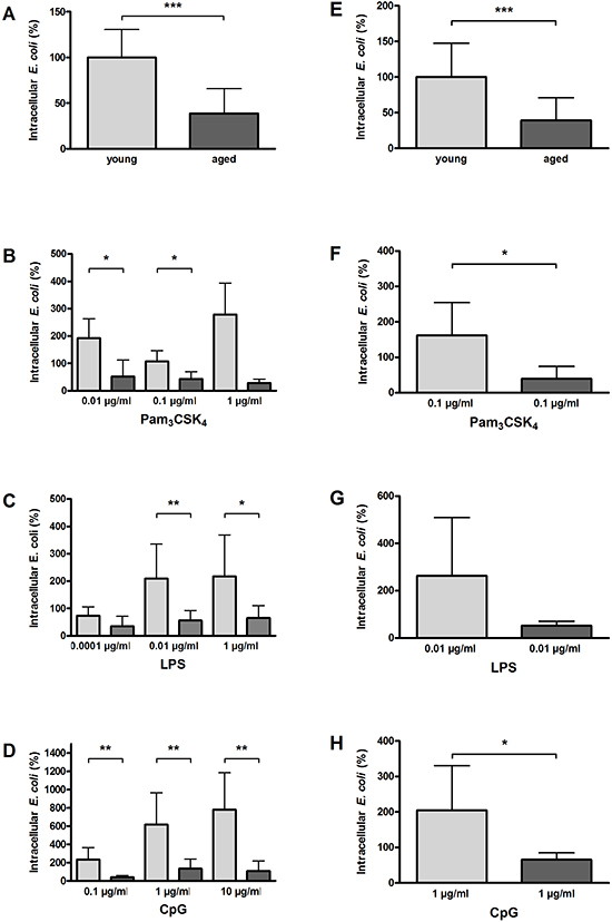 Figure 6: Phagocytosis of E. coli K1 by macrophages (A–D) and microglial cells (E–H) from young and aged mice in vitro. In non-activated state, phagocytosis of E. coli was significantly lower in aged compared to young macrophages (n = 9/9) (A) and in aged compared to young microglial cells (n = 15/13) (E). Macrophages from aged mice phagocytosed significantly less E. coli than macrophages from young mice after treatment with different concentrations of Pam3CSK4 (B), LPS (C), and CpG (D) (n = 6–9 per group). Similarly, microglial cells from aged mice phagocytosed less E. coli than microglial cells from young mice after treatment with a selected dose of Pam3CSK4 (F), LPS (G), and CpG (H) (n = 6 per group). Data are shown as means ± SD; *p < 0.05, **p < 0.01, ***p < 0.001, Student’s t-test, Bonferroni correction in B, C, and D.