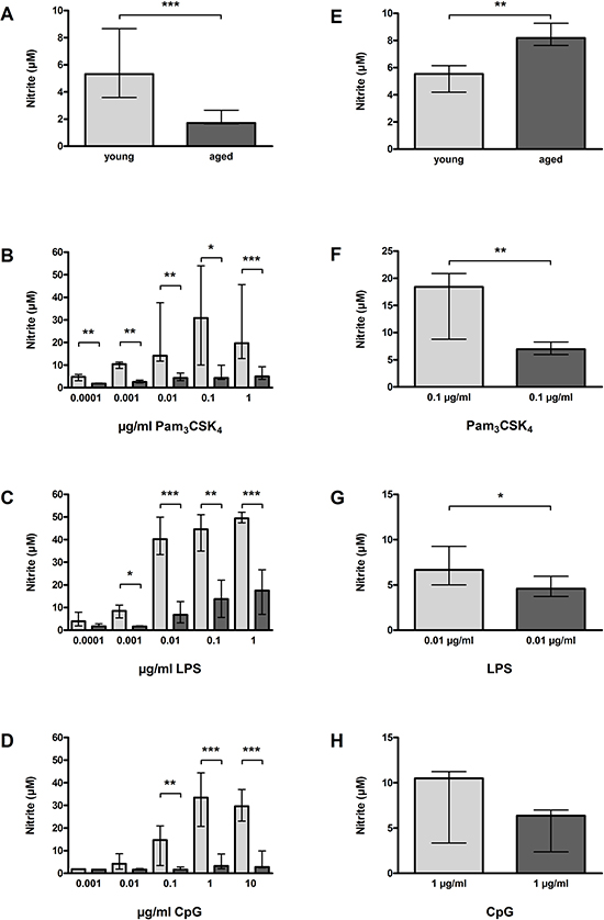 Upon stimulation with the three different TLR agonists, NO release by young macrophages increased in a dose-dependent manner, whereas NO release by aged macrophages remained on low levels. Thus, NO release of aged macrophages was significantly lower than that of young macrophages after stimulation with Pam3CSK4 (0.0001 μg/ml: p = 0.002; 0.001 μg/ml: p = 0.003; 0.01 μg/ml: p = 0.0005; 0.1 μg/ml: p = 0.02; 1 μg/ml: p = 0.0005; Figure 7B), LPS (0.001 μg/ml: p = 0.02; 0.01 μg/ml: p = 0.005; 0.1 μg/ml: p = 0.005; 1 μg/ml: p = 0.0005; Figure 7C), and CpG (0.1 μg/ml: p = 0.002; 1 μg/ml: p = 0.0005; 10 μg/ml: p = 0.0005; Figure 7D).