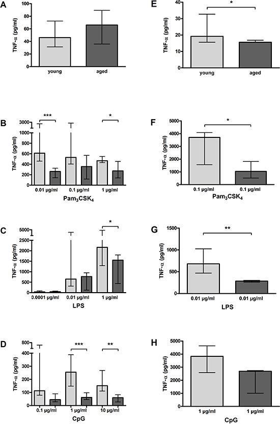 Figure 8: TNF-α release by macrophages (A–D) and microglial cells (E–H) from young and aged mice in vitro. In non-activated state, TNF-α release form aged and young macrophages did not differ significantly (n = 14/21) (A), however, it was slightly but significantly lower in aged compared to young microglial cells (n = 15/14) (E). Macrophages from aged mice released less TNF-α than macrophages from young mice after treatment with different concentrations of Pam3CSK4 (n = 12–18) (B), LPS (n = 6–15) (C), and CpG (n = 9–15) (D). Similarly, microglial cells from aged mice released less TNF-α than microglial cells from young mice after treatment with a selected dose of Pam3CSK4 (n = 6) (F), LPS (n = 6) (G), and CpG (n = 5) (H). Data are shown as medians (25./75. percentile); *p < 0.05, **p < 0.01, ***p < 0.001, Mann-Whitney U-test, Bonferroni correction in B, C, and D.