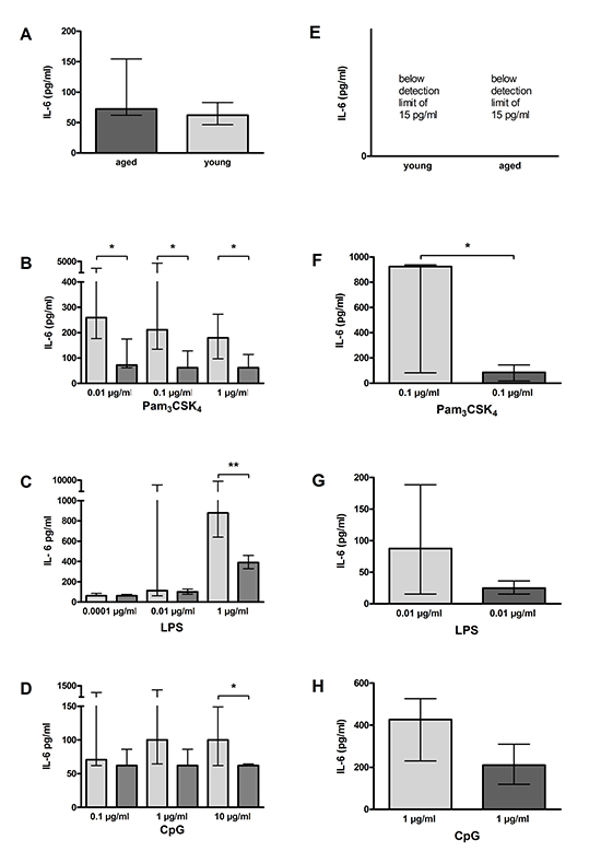 Figure 9: IL-6 release by macrophages (A–D) and microglial cells (E–H) from young and aged mice in vitro. In non-activated state, IL-6 release form aged and young macrophages did not differ (n = 14/21) (A). IL-6 concentrations in supernatants of aged and young macrophages were below the detection limit (E). Macrophages from aged mice released less IL-6 than macrophages from young mice after treatment with different concentrations of Pam3CSK4 (n = 12–18) (B), LPS (n = 6–15) (C), and CpG (n = 9–15) (D). Similarly, microglial cells from aged mice released less IL-6 than microglial cells from young mice after treatment with a selected dose of Pam3CSK4 (n = 6) (F), LPS (n = 6) (G), and CpG (n = 5) (H). Data are shown as medians (25./75. percentile); *p < 0.05, **p < 0.01, ***p < 0.001, Mann-Whitney U-test, Bonferroni correction in B, C, and D.