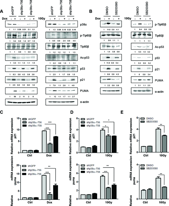 Figure 2: p38α is required for the induction of Tip60-T158 phosphorylation, p53-K120 acetylation and p21WAF1 and PUMA expression following DNA damage. (A) U2OS cells transduced with shRNA for GFP (shGFP) or p38α (shp38α-756 or -758) were treated with 1 μM of Dox for 36 h (left panels) or 10 Gy of γ-radiation followed by incubation for 72 h (right panels). Cell lysis was subjected to Western blot analysis detecting the indicated proteins. (B) U2OS cells were pre-treated with 10 μM of the p38 inhibitor SB203580 or DMSO for 1 h, and then treated in the presence of SB203580 or DMSO with 1 μM of Dox for 36 h (left panels) or 10 Gy of γ-radiation followed by incubation for 72 h (right panels). Cell lysis was subjected to Western blot analysis detecting the indicated proteins. (C–D) U2OS cells transduced with shRNA for GFP (shGFP) or p38α (shp38α-756 or -758) were treated with 1 μM of Dox for 36 h (C) or 10 Gy of γ-radiation followed by incubation for 72 h (D) mRNA levels of PUMA (lower panels) and p21WAF1 (upper panels) were detected by real-time PCR. Values are mean ± SEM for triplicates. (E) U2OS cells were pre-treated with 10 μM of the p38 inhibitor SB203580 or DMSO for 1 h, and then treated in the presence of SB203580 or DMSO with 10 Gy of γ-radiation followed by incubation for 72 h. mRNA levels of PUMA (lower panel) and p21WAF1 (upper panel) were detected by real-time PCR. Values are mean ± SEM for triplicates.