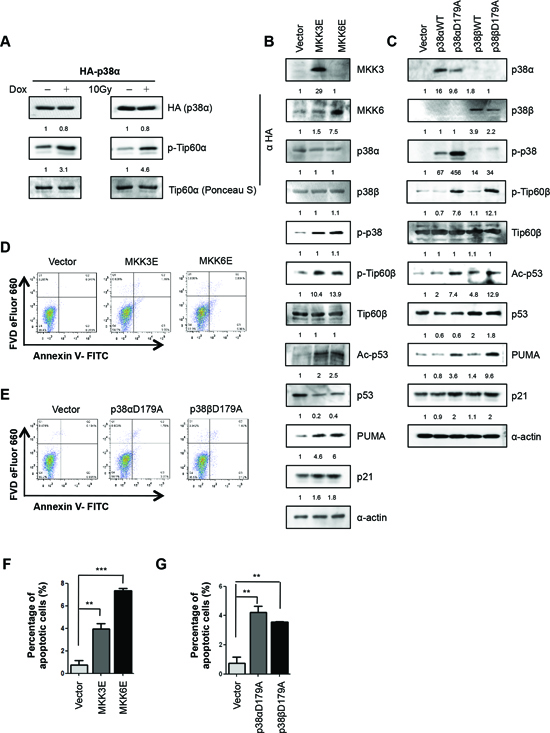 Figure 7: Activated p38α directly phosphorylates Tip60-T158 in vitro and induces Tip60-T158 phosphorylation, p53-K120 acetylation, PUMA expression and apoptosis in cells. (A) Immunoprecipitation-coupled Kinase Assays for p38α. HA-p38α was immunoprecipitated from U2OS cells transduced with HA-p38α and treated with 1 μM of Dox for 36 h (left panels) or 10 Gy of γ-radiation followed by incubation for 48 h (right panels), and then incubated with recombinant Tip60α in the presence of cold ATP. Immunoprecipitated HA-p38α and Tip60-T158 phosphorylation were detected by Western blot using an anti-HA antibody and an anti-Tip60pT158 antibody, respectively. Input of recombinant Tip60α was stained by Ponceau S. (B) Western blot analysis of U2OS cells transduced with MKK3E, MKK6E or vector (Babe-puro), detecting MKK3, MKK6, p38α, p38β, p-p38, p-Tip60-T158, Tip60, ac-p53-K120, p53, PUMA, p21WAF1 and actin. Cells were lysed on day 3 post MKK3/6E transduction after selection of transduced cells. (C) Western blot analysis of U2OS cells transduced with wild-type (p38αWT, p38βWT) or indicated active mutant of p38 isoforms (p38αD179A, p38βD179A) or vector (Babe-puro), detecting p38α, p38β, p-p38, p-Tip60-T158, Tip60, ac-p53-K120, p53, PUMA, p21 and actin. Cells were lysed on day 3 post p38 transduction after selection of transduced cells. (D) FACS analysis of U2OS cells transduced with MKK3E, MKK6E or vector. Cells were collected on day 3 post MKK3/6E transduction after selection of transduced cells, and stained with a FITC-conjugated anti-Annexin-V antibody and FVD eFlour 660. (E) FACS analysis of U2OS cells transduced with wild-type (p38αWT, p38βWT) or indicated active mutant of p38 isoforms (p38αD179A, p38βD179A) or vector. Cells were collected on day 3 post p38 transduction after selection of transduced cells, and stained with a FITC-conjugated anti-Annexin-V antibody and FVD eFlour 660. (F) Quantification and statistical analysis of the data in D. The percentage of apoptotic cells was quantified as the percentage of FITC-positive cells in the gated area. Values are mean ± SEM for triplicates. (G) Quantification and statistical analysis of the data in E. The percentage of apoptotic cells was quantified as the percentage of FITC-positive cells in the gated area. Values are mean ± SEM for triplicates.