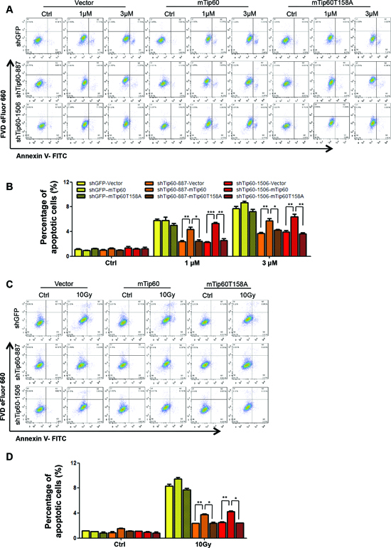 Figure 5: Tip60 is required for apoptosis induction in response to DNA damage. (A–B) U2OS cells transduced with shRNA for GFP (shGFP) or Tip60 (shTip60-887 or -1506) were treated with 1 μM or 3 μM of Dox for 24 h (A) or 10 Gy of γ-radiation followed by incubation for 24 h (B). Cells were collected, stained with an FITC-conjugated anti-Annexin-V antibody and FVD eFlour 660 and analyzed by FACS. (C–D) Quantification and statistical analysis of the data in A (C) or B (D). The percentage of apoptotic cells was quantified as the percentage of FITC-positive cells in the gated area. Values are mean ± SEM for triplicates.