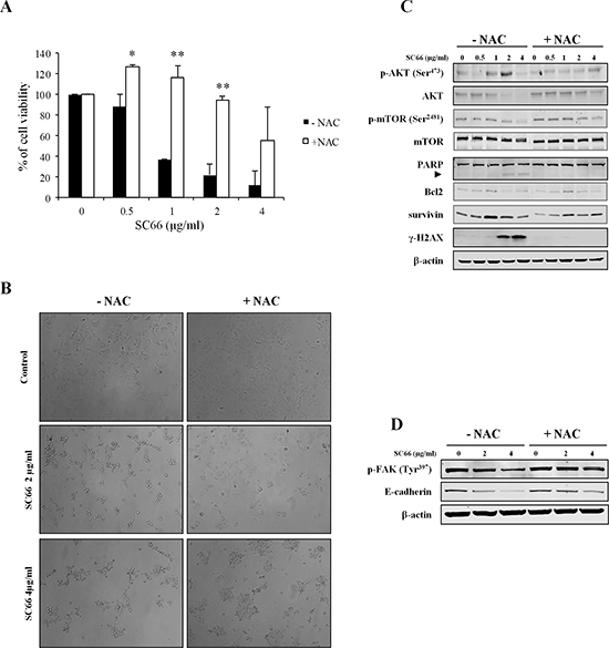 We hypothesized that by inhibiting ROS effects NAC might revert the effects of SC66 on cell viability, and also inhibit SC66-induced anoikis. In order to validate this hypothesis we evaluated cell viability after SC66 treatment with and without NAC. The histograms in Figure 6A demonstrated that the presence of NAC reverted the effects of SC66 on cell viability at low drug doses, whereas it partially inhibited the effects at 4 μg/ml. At the molecular level, Western blot analysis also showed an almost complete recovery of phosphorylated and total AKT levels in Hep3B cells treated with SC66 in the presence of NAC (Figure 6C), as well as inhibition of PARP cleavage (Figure 6C).