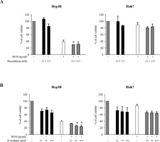 We next examined combination of SC66 with conventional chemotherapeutic drugs, such as doxorubicin, which is used in clinical protocols for HCC treatment, or with new target specific drugs, such as the mTOR inhibitor everolimus (also known as RAD001), currently under clinical trials in different cancer types, including HCC. We measured the cytotoxic effects after 24 hours of combination of SC66 with doxorubicin and with everolimus in both HCC cell lines using MTS assays (Figure 7). Hep3B and Huh7 cells were treated with SC66 at a single concentration (1 μg/ml) and two different concentrations of doxorubicin (62.5 and 125 nM) (Figure 7A), or three concentrations of everolimus (10-50-100 nM) (Figure 7B). In comparison with single treatments, combination treatments significantly reduced cell viability only in Hep3B cells.