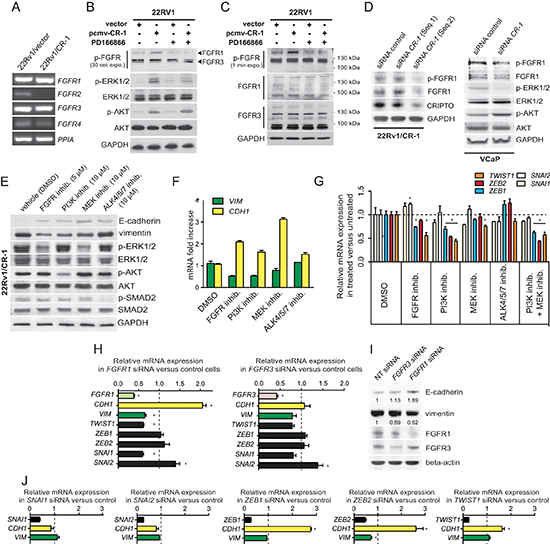 Figure 4: Mesenchymal differentiation elicited by CR-1 overexpression is mediated through parallel actions of AKT and FGFR signals and changes in expression of EMT-TF genes. (A) RT-PCR analysis depicting the mRNA levels of the FGFR genes in 22Rv1/vector and 22Rv1/CR-1 cells. The housekeeping gene PPIA is used as an internal control (B) Immunoblots assessing the effect CR-1 cDNA transfection or control vector in 22Rv1, left untreated, or treated with FGFR inhib. (PD166866; 5 μmol/L). Phosphorylation of AKT, ERK1/2, and FGFR was analyzed. (C) The same samples were subjected to immunoblotting for FGFR1 and FGFR3 proteins. (D) Immunoblots made against the indicated proteins from 22Rv1/CR-1 and VCaP cells treated with control or two siRNAs targeting CR-1. (E) 22Rv1/CR-1 cells were treated with inhibitors to PI3K (LY294002, 10 μmol/L), MEK (U0126, 10 μmol/L), FGFR (PD166866, 5 μmol/L), ALK4/5/7 (SB 431542, 10 μmol/L) for 40h and lysates analyzed as above. (F) Parallel qRT-PCR analysis for CDH1 (E-cadherin) and VIM (vimentin) mRNA levels. (G) qRT-PCR revealing perturbations of ZEB1, ZEB2 and TWIST1 levels in inhibitor-treated 22Rv1/CR-1 cells. (H) qRT-PCR analysis for FGFR1, FGFR3, CDH1, VIM, and EMT-TFs following targeting of FGFR1 or FGFR3. (I) Parallel WB analysis for E-cadherin and vimentin. (J) 22Rv1/CR-1 cells were treated with non-targeting siRNAs or siRNAs against ZEB1, ZEB2, SNAI1, SNAI2, or TWIST1, and mRNA levels of CDH1, VIM, and knockdown target genes were assessed by qRT-PCR. Error bars represent n = 3, mean ± sem.