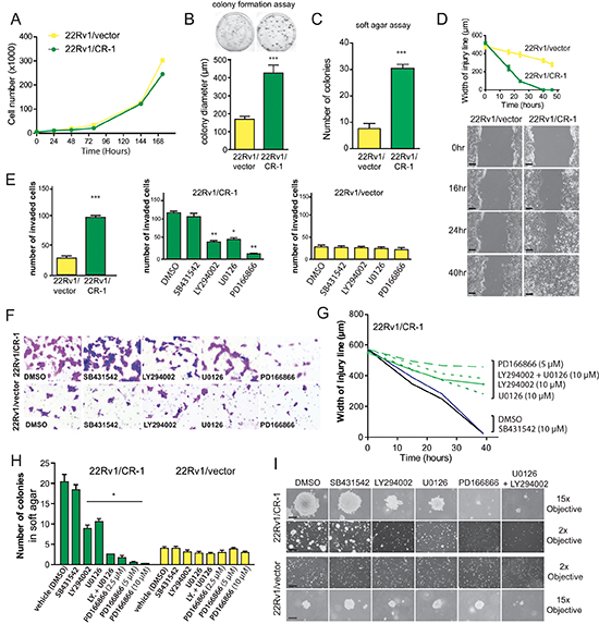Figure 5: CRIPTO overexpression is associated with increased malignant properties of prostate cancer cells. (A) Anchorage-dependent growth rates of 22Rv1/vector and 22Rv1/CR-1 cells over a 7-day period in standard medium. (B) 22Rv1/vector and 22Rv1/CR-1 cells were assayed for colony formation in monolayer cultures (C) Colony formation ability of 22Rv1/CR-1 cells compared to 22Rv1/vector cells in soft agar. (D) The two lines were analyzed for migratory by photography 0, 24 or 40 hours after wounding; Scale bars, 200 μm. Width of the injury line at the different time points is depicted. (E) Invasion of the two lines as assessed by Boyden chamber assay under untreated or treated conditions. (F) Representative images of invaded cells (microscopic fields at 20x objective magnification). (G) Width of injury line from wounding-healing assays in untreated or treated cells. (H) The 22Rv1/CR-1 and 22Rv1/vector cells were grown in soft agar for three days and then treated with the indicated inhibitors for an additional 11 days. The number of colonies presented is the mean of colony counts in ten 100x microscopic fields from three wells. (I) Representative photomicrographs from the previous experiment; Scale bars, 150 μm, 1000 μm. All assays were performed in triplicate. Bars; Means, Error bars, ± sem ; *** p < 0.001. ** p < 0,01.* p < 0,05.