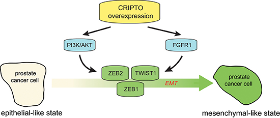 Figure 6: Working model of the regulatory role of CRIPTO in regulating epithelial-mesenchymal transition in human prostate cancer cells. Aberrant CR-1 expression can increase the activation of AKT and FGFR1, leading to deregulation of prostate epithelial differentiation towards a mesenchymal state that is coordinated by ZEB1, ZEB2 and TWIST1.