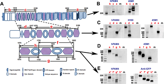 Figure 5: Mapping the PAM4-reactive epitope on human MUC5AC. (A) Schematic diagram of different MUC5AC recombinant fragments (a–h) generated in PANC-1 cells for mapping PAM4 epitope; Numbers are AA positions in the MUC5AC protein sequence (UniProtKB/Swiss-Prot: P98088). (B to E) Western blot of various MUC5AC recombinant fragments by hPAM4, anti-MUC5AC, or anti-GFP antibodies, as indicated. See text for details. Lane m indicates samples from untransfected cells.