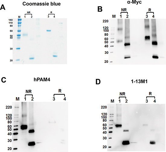 Figure 6: SDS-PAGE and Western blot analyses of recombinant MUC5AC fragments expressed in E. coli. Four gels were run under similar conditions of SDS-PAGE. (A) One gel was stained with coomassie blue. The other three gels were transferred onto nitrocellulose membrane and stained with anti-Myc, hPAM4, and 1-13M1, in (B, C, and D) respectively. Samples, either reduced (R) or non-reduced (NR), were loaded at 500 ng/well; lane M, markers; lanes 1 & 3, Cys2-3-4 (AA1575-2052); lanes 2 &4, Cys2+ (AA1575-1725).