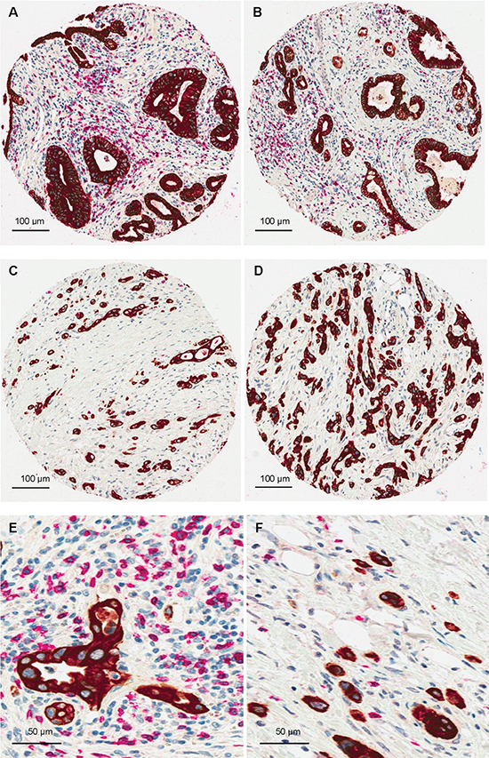 Figure 2: CD8/Pancytokeratin double staining demonstrating a strong negative correlation between EMT-type tumor budding and CD8+T-cells. (A and B) Examples of PDAC with numerous peritumoral CD8+T-cells and absence of tumor buds, x100 (Bar:100 μm); (C and D) PDACs with high-grade tumor budding and markedly reduced peritumoral CD8+T-cell counts, x100 (Bar:100 μm); (E) PDAC with numerous peritumoral CD8+T-cells and absence of tumor buds, x400 (Bar:50μm); (F) PDAC with high-grade tumor budding and markedly reduced peritumoral CD8+T-cell counts, x400 (Bar:50 μm).