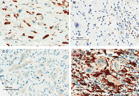 Figure 3: Snapshots of the tumor microenvironment of PDAC demonstrating tumor budding cells surrounded by numerous FOXP3+T-cells (A, x400, Bar:50μm); moderate counts of CD4+T-cells (B, x400, Bar:50μm); isolated iNOS-macrophages (C, x400, Bar:50μm) and dense infiltrates of CD163-macrophages (D, x400, Bar:50μm).