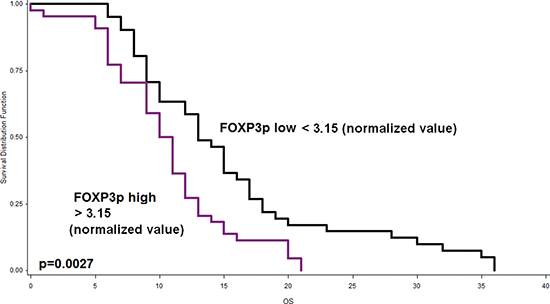Figure 4: Kaplan-Meier curve indicating the prognostic effect of peritumoral FOXP3+T-cell infiltrates on outcome of PDAC patients. Patients with low FOXP3+T-cell counts exhibit significantly longer survival (p = 0.027).
