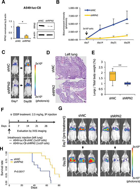 To validate the function of RPN2 as a regulator of lung tumor progression in vitro, we first established stable clones of A549-luc-C8 cells expressing shRNA against RPN2 (A549-luc-C8-shRPN2) or control shRNA (A549-luc-C8-shNC). The reduced expression of RPN2 was verified by qRT-PCR and western blot analysis (Figure 3A). We examined the effects of A549-luc-C8-shRPN2 cells on tumorigenicity and drug resistance using lung cancer xenograft models established by direct intrathoracic injection (left lung) into scid mice. Using bioluminescence imaging, we found that the primary lung tumor growth of A549-luc-C8-shRPN2 cells (n = 10) was less than that of A549-luc-C8-shNC cells (n = 10) (Figure 3B, 3C). Histological analyses also revealed that RPN2 silencing represses the tumor growth of this lung cancer cell line (Figure 3D). Additionally, the weight of the lungs significantly decreased in the A549-luc-C8-shRPN2-bearing mice group (Figure 3E). However, none of the mice from either group developed distant metastases during the observation period; therefore, we could not investigate the metastatic phenotypes regulated by RPN2 in vivo. Next, to investigate whether RPN2 silencing affects the drug resistance of A549-luc-C8 cells to CDDP in vivo, tumors were initiated in scid mice and then followed by an intraperitoneal injection of 2.5 μg/kg CDDP once a week for three weeks (Figure 3F). At four weeks after orthotopic transplantation, the tumors formed in the A549-luc-C8-shRPN2-bearing mice (n = 10) were significantly smaller compared with the tumors in the A549-luc-C8-shNC-bearing mice (n = 10) based on bioluminescence imaging results (Figure 3G). All the mice were evaluated for survival, and A549-luc-C8-shRPN2-bearing mice survived longer than the A549-luc-C8-shNC-bearing mice (Figure 3H; P = 0.0149). Together, these results indicate that RPN2 silencing confers therapeutic and survival advantages to lung cancer cells in vivo.