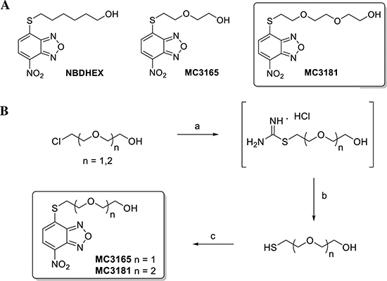 Figure 1: Structures and preparation of the NBDHEX derivatives MC3165 and MC3181. (A) Chemical structures of NBDHEX, MC3165 and MC3181. (B) Scheme of MC3165 and MC3181 preparation. The compounds were obtained by a nucleophilic displacement reaction between the commercial 4-chloro-7-nitrobenzo[c][1,2,5]oxadiazole and the 2-(2-mercaptoethoxy)ethanol and the 2-(2-(2-mercaptoethoxy)ethoxy)ethanol, respectively. Reagents and conditions: a) Thiourea, H2O, N2, reflux, 18h; b) NaOH 5N, N2, reflux, 3h; c) 4-chloro-7-nitrobenzo[c][1,2,5]oxadiazole, EtOH:H2O (0.3:1), pyridine, r.t., 4h.
